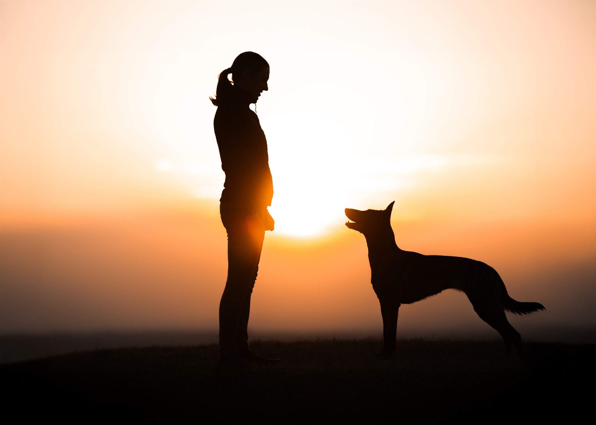 když slunce mizí za obzorem, psi se mění v dramatické siluety proti planoucímu nebi
